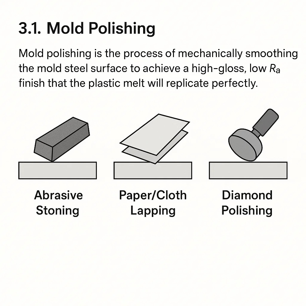 Полірування прес-форми – це процес механічного вирівнювання сталевої поверхні форми для досягнення високого блиску та низького R a обробка, щоб розплав пластику ідеально повторювався.