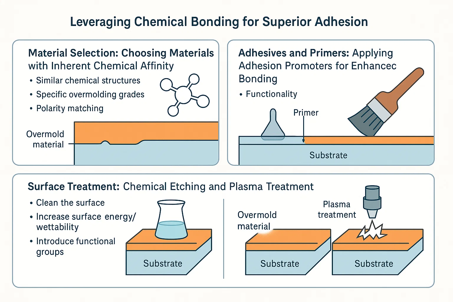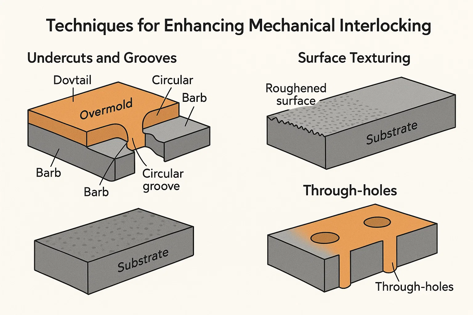 Механічне травлення/текстурування: Створення мікроскопічно шорсткої поверхні на підкладці може значно посилити механічне замикання . Цього можна досягти за допомогою таких методик, як піскоструминство, лазерне травлення або навіть шляхом проектування текстури безпосередньо в першу форму пострілу. Збільшена площа поверхні також забезпечує більше точок для потенційної хімічної взаємодії.