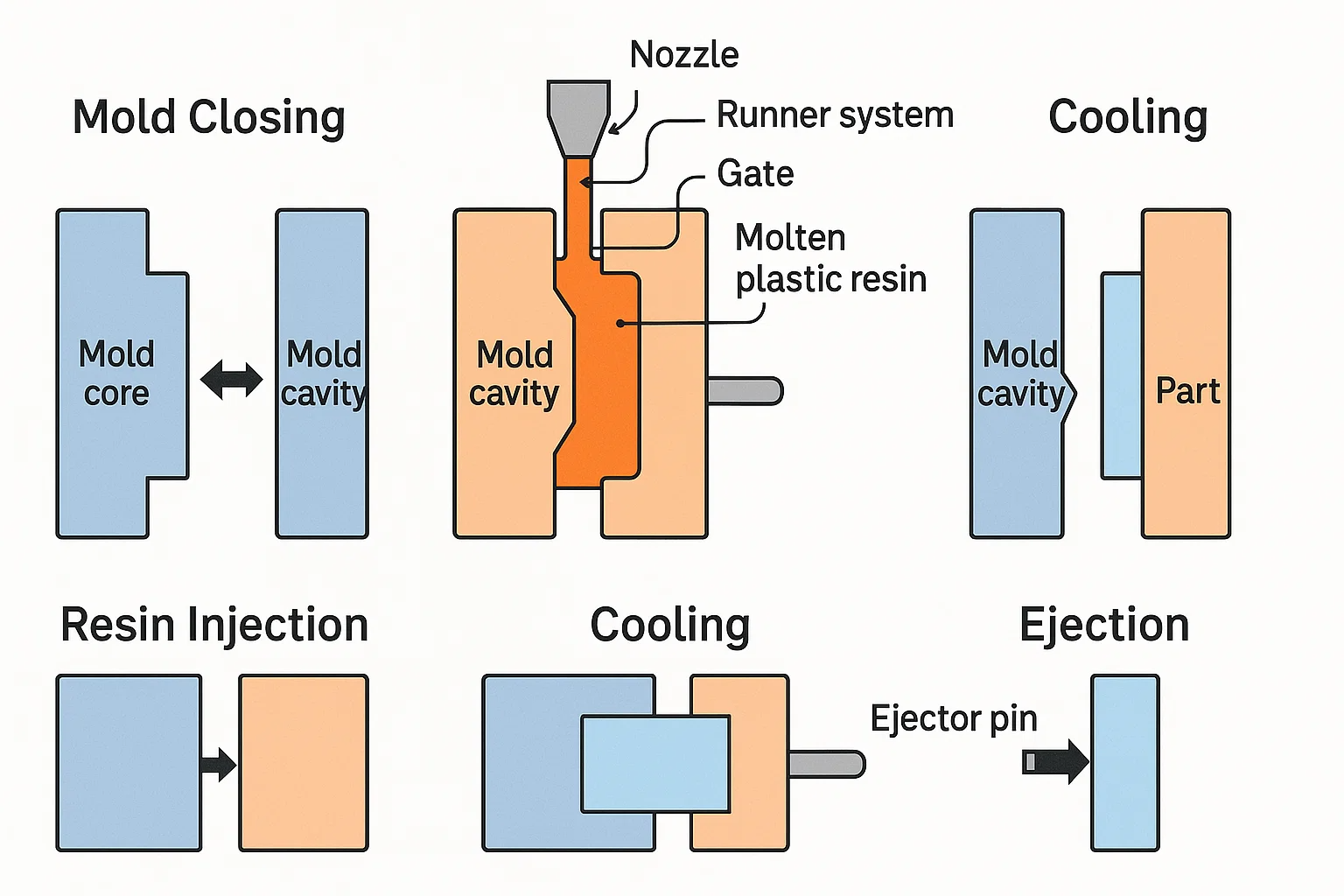 Ін'єкція смоли: Розплавлена пластикова смола вводиться під високий тиск через насадку та у форму. Матеріал проходить через Система бігуна і ворота - що є частиною половини порожнини - і заповнює простір між серцевиною і порожниною. Суспільство витісняє смолу, щоб утворити внутрішню форму частини, тоді як порожнина утворює зовнішню оболонку.