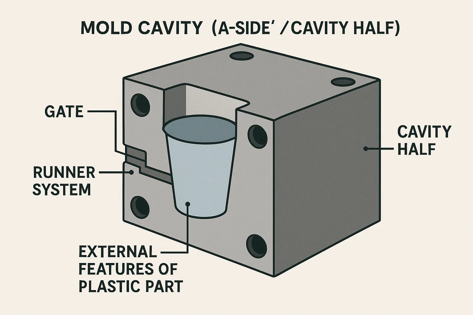 З порожнина цвілі , також відомий як "-сторона" або "половина порожнини"-це компонент, який утворює Зовнішні функції пластичної частини. Це зовнішня оболонка або ємність, яку розплавлений пластик заповнюється. Використовуючи аналогію пластикової чашки, порожнина утворювала б зовнішню частину чашки, включаючи губу та зовнішні стіни.