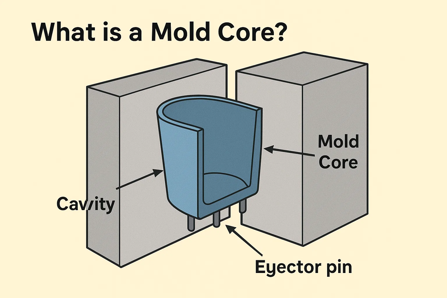 Наприклад, якщо ви формуєте пластикову чашку, серцевиною була б частина, яка утворює внутрішню частину чашки. Для порожнистої коробки ядро формувало б внутрішній простір. Ядро, як правило, містить такі функції, як шпильки для викиду, які використовуються для виштовхування готової частини з форми після її охолодження. Оскільки він формує внутрішню форму, серцевина часто має більш складну конструкцію з такими ознаками, як ребра, боси (циліндричні виступи для монтажу) та інші хитромудрі деталі.