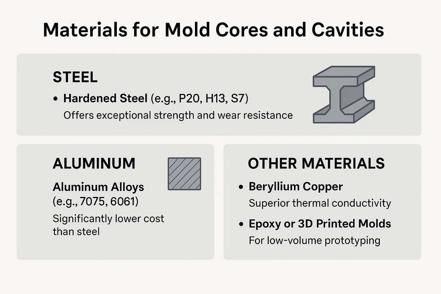 Переваги: Алюміній пропонує кілька переваг, включаючи значно меншу вартість, ніж сталь, і набагато швидший час обробки. Його відмінна теплопровідність дозволяє швидше охолодити, що може скоротити час циклу формування впорскування.