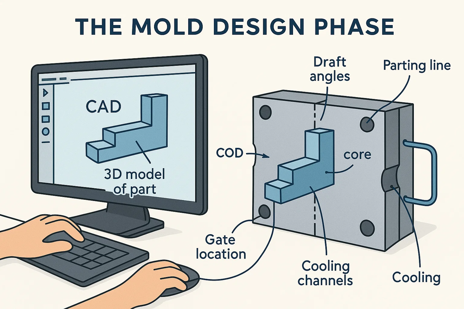З чітким розумінням того, як ліплення ін'єкцій перетворює сирий пластик у готові частини, тепер ми можемо оцінити першорядне значення Фаза дизайну форми . Тут справді починається магія, оскільки абстрактні ідеї та 2D ескізи перетворюються на точний цифровий план, який керуватиме фізичним створенням форми. Це ретельний процес, коли кожна крива, кут та розмір кінцевої частини пластичної моделі ретельно розглядаються та перекладаються в геометрію форми.