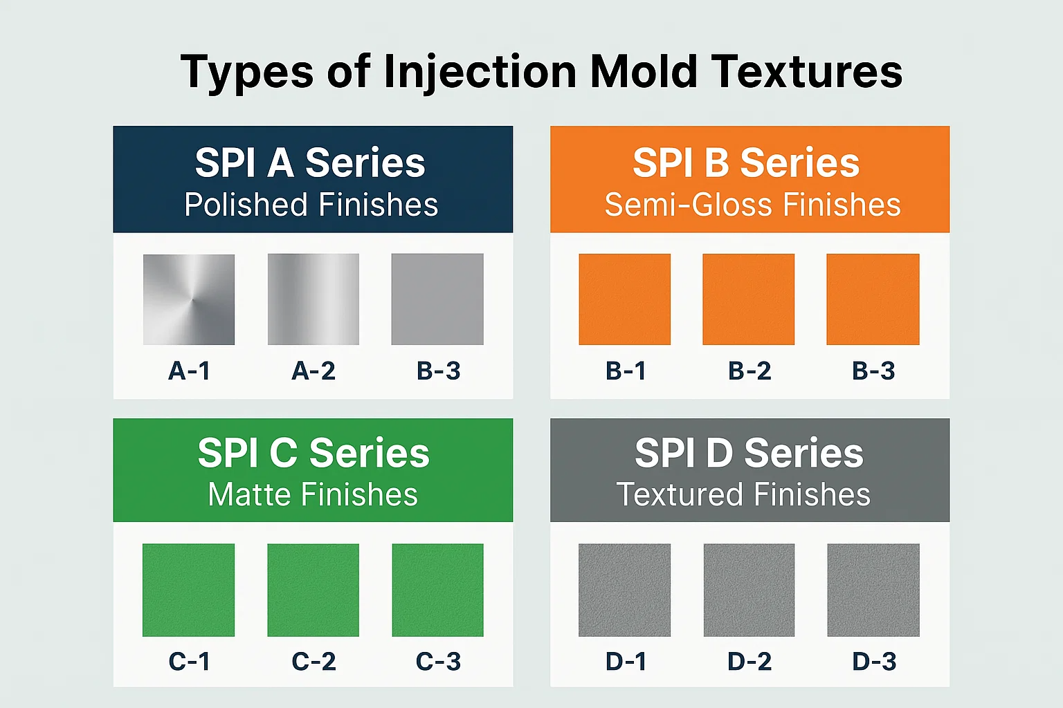 Світ текстур ін'єкційної форми є величезним, але він значною мірою стандартизований системою, розробленою Товариством пластмасової галузі (SPI). Розуміння цих стандартів має вирішальне значення для визначення точної обробки, необхідної для частини.