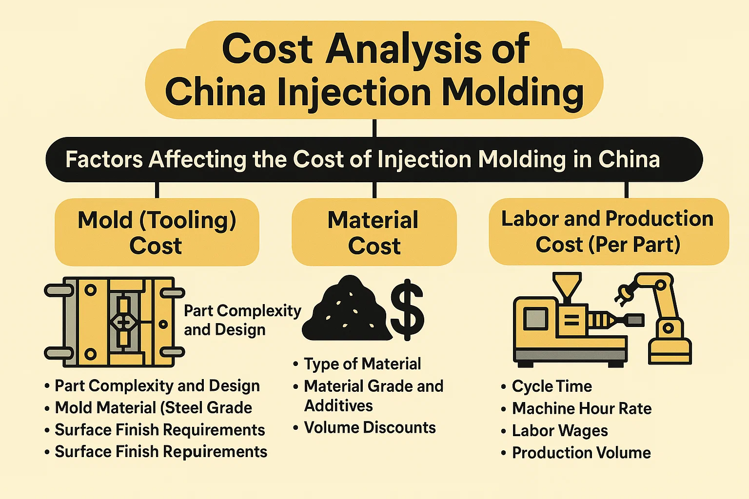 Однією з основних мотивацій компаній вибирати Китай для лиття ін'єкцій є сприйнята перевага витрат. Хоча Китай, як правило, пропонує більш конкурентоспроможні ціни, ніж у багатьох західних країнах, розуміння різних факторів, що сприяють загальній вартості, має вирішальне значення для точного бюджету та уникнення несподіваних витрат. Загальна вартість проекту ін'єкційного лиття може бути в основному класифікується на вартість цвілі (інструменту), вартість матеріалів та виробництва (праці/машина).