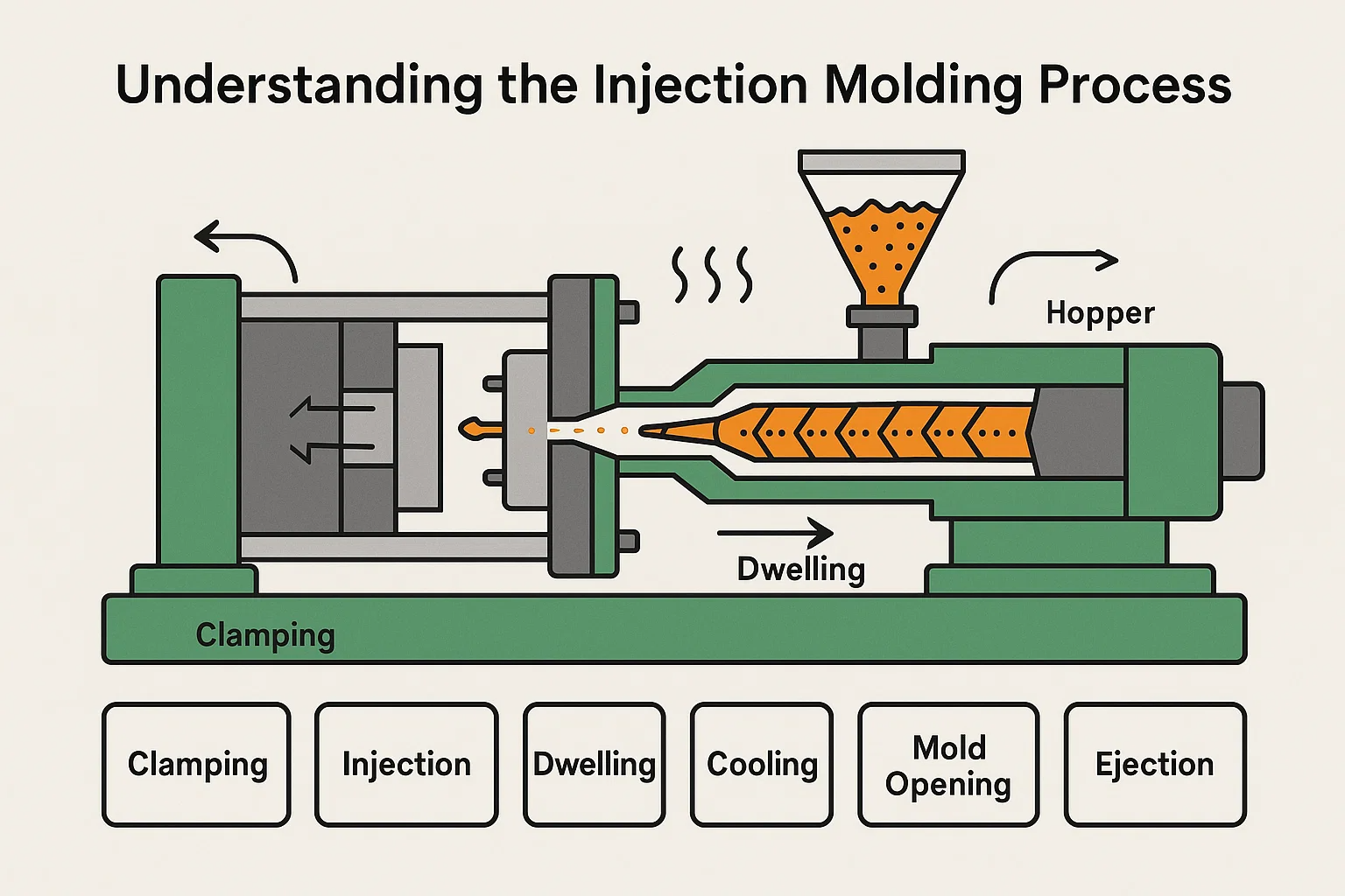 Процес ін’єкційного лиття - це циклічна операція, яка, з’являється простою, передбачає точне контроль температури, тиску та термінів для створення послідовних частин. Ось основні кроки: