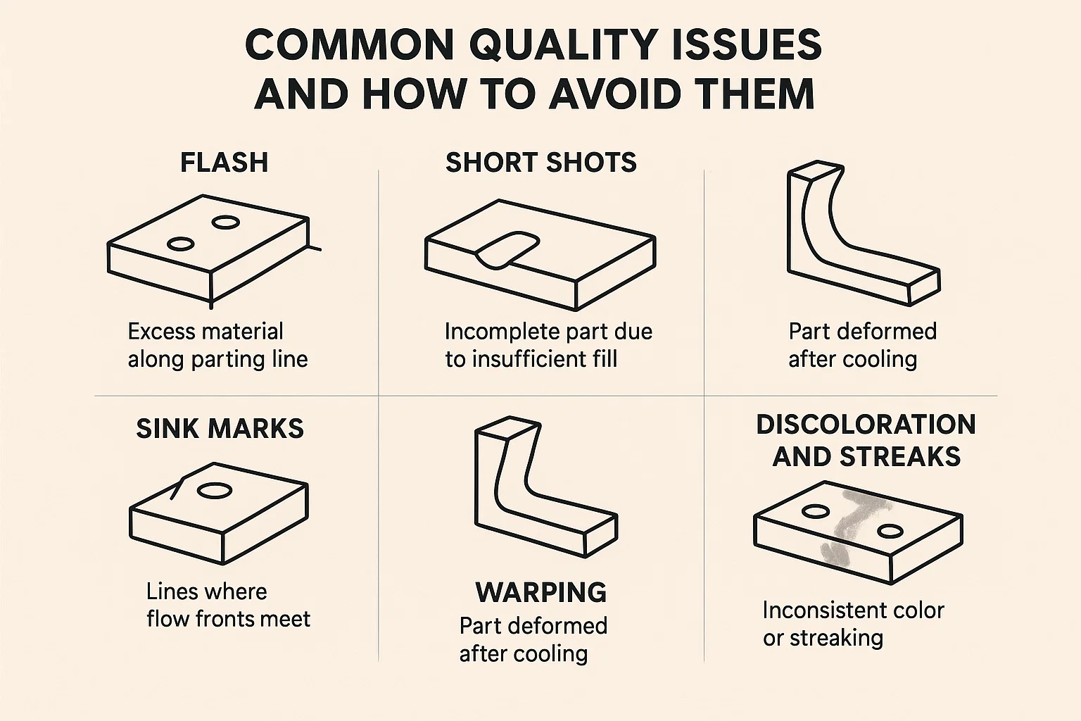 - Чому: Підвищення потребують додаткових, дорогих цвіжних механізмів, таких як слайди (бічні дії), підйомники або ядро, щоб дозволити викинути деталь. Вони додають у форму складності, вартості та обслуговування.
