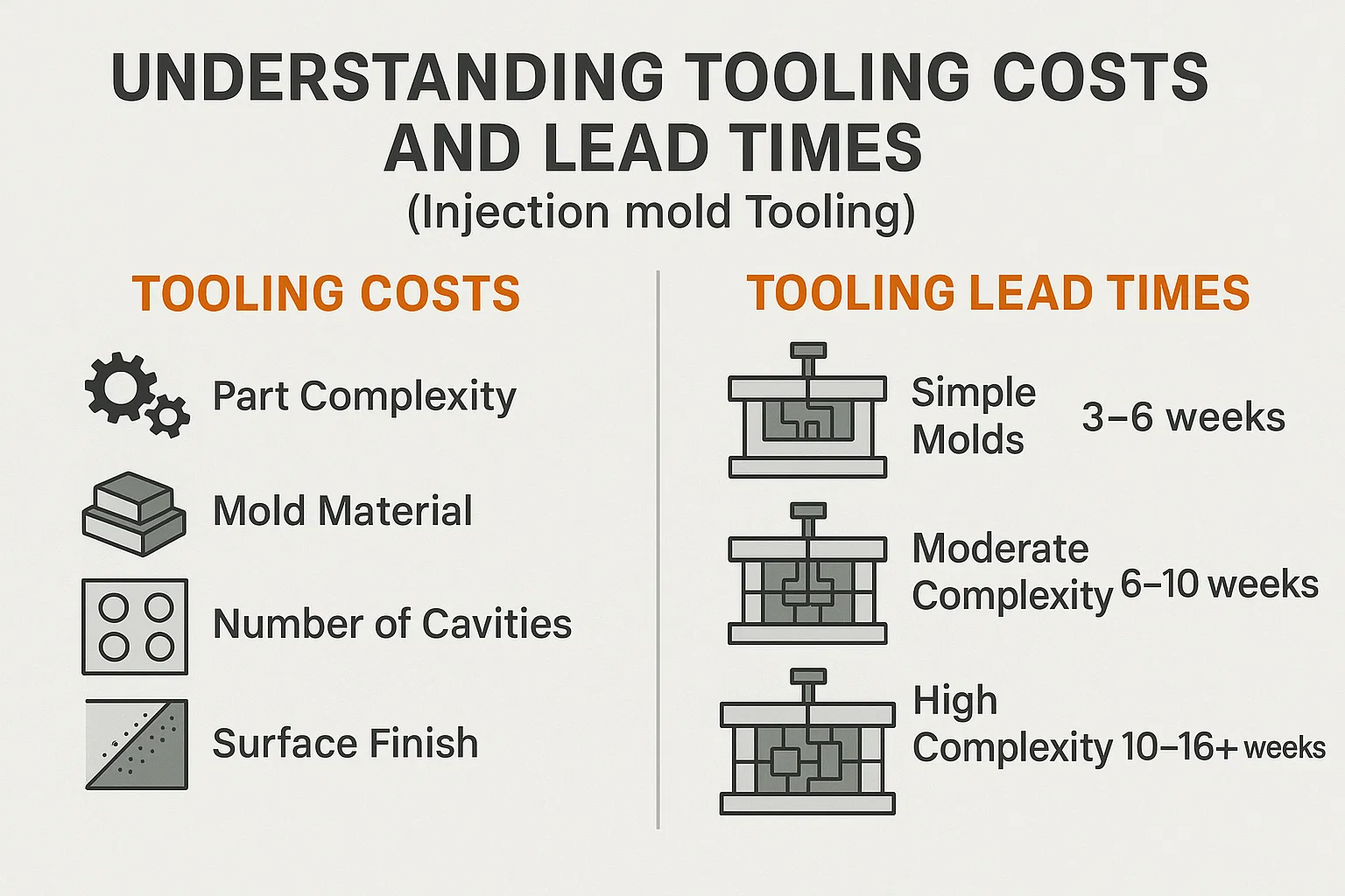 - Кількість порожнин: У формі може бути одна порожнина (виробляючи одну частину на цикл) або кілька порожнин (виробляючи кілька частин на цикл). Мультизаводні форми мають більш високу вартість початкових інструментів, але різко знижує вартість виробництва на частину за рахунок збільшення виробництва за цикл, що робить їх економічними для великих об'ємних пробіжок.